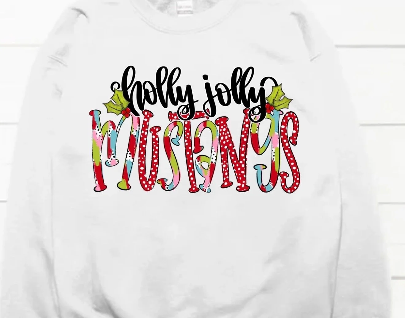 Holly Jolly Mustangs with Little Debbie design on White Gildan Crewneck